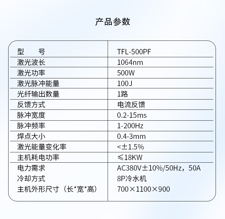 通發(fā)激光TFL-500PF光纖激光焊接機(jī),激光功率大,經(jīng)過光纖優(yōu)化獲得卓越的光束質(zhì)量,滿足1.5mm以內(nèi)料厚,熔深1mm以內(nèi)的廚衛(wèi),家電,高速不銹鋼激光焊接加工。