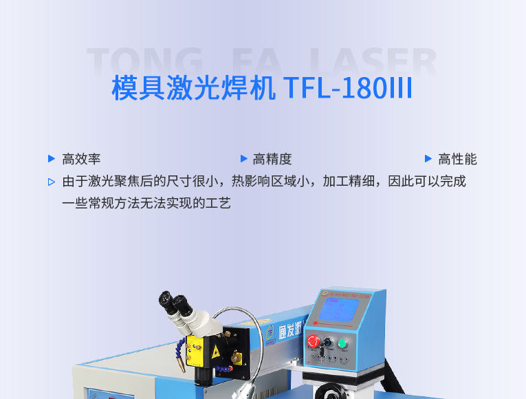 普通型模具激光焊機TFL-180Ⅲ是通發(fā)激光公司的模具激光焊機中銷量較大的傳統(tǒng)型,配置激光頭手搖升降與工作臺按鈕電動升降實現(xiàn)焊接不同厚度模具的激光焊加工。本系列機型適用于各類精密注塑模具激光補焊、壓鑄模具激光修補焊接;同時也適合鑄件沙孔激光修補、模具磨損激光修復、過切加工等的激光修補;各類金屬結(jié)構(gòu)件激光焊接加工、不銹鋼首飾激光焊接加工。