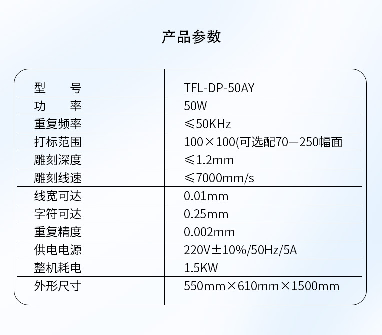 通發(fā)激光研發(fā)TFL-DP-50AY激光打標(biāo)機(jī),可針對(duì)各種金屬,塑膠進(jìn)行激光打標(biāo)加工,本激光鐳雕機(jī)配置成熟國(guó)產(chǎn)激光器,國(guó)產(chǎn)振鏡、國(guó)產(chǎn)軟件,性?xún)r(jià)比高,是普通金屬打標(biāo)機(jī)的好選擇!!!
