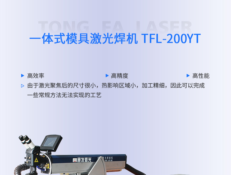 通發(fā)激光一體式模具激光焊機(jī)TFL-200YT/TFL-400YT是一款多種功能融合一體的新型模具激光焊接機(jī),針對特大型塑料模具激光焊、中型注塑模具激光燒焊、小型塑膠模具激光補(bǔ)焊、壓鑄模激光補(bǔ)焊具等各類模具可實現(xiàn)超精密修復(fù),幫您解決大型汽車模具修復(fù)難題,不需要模具移動,電動工作臺與立體旋轉(zhuǎn)激光頭完美結(jié)合,操作桿控制運(yùn)動移動實現(xiàn)輕松激光修復(fù)大型模具,同時也保留了傳統(tǒng)手動工作臺超精密修復(fù)模具功能。