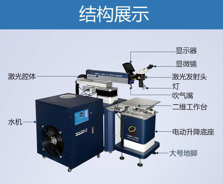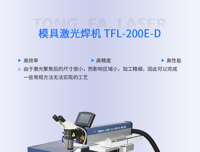 出口型模具激光焊機是通發(fā)激光公司專門為出口國外客戶使用而設計的系列機型TFL-200E-D,配置激光頭電動升降,同時配置操縱桿無極調速控制XY橫向和縱向電動移動。適用于各類精密注塑模具、壓鑄模具等模具激光修補焊接;同時也適合鑄件沙孔激光修補、模具崩缺激光修復、過切加工等的激光修補;各類金屬結構件、金銀首飾的激光焊接加工。